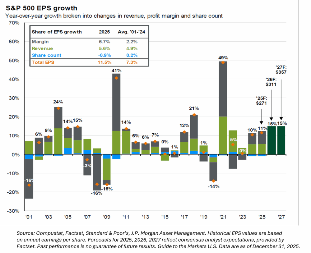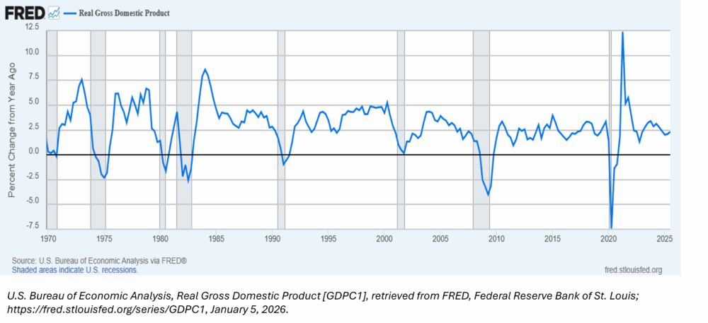 After a major disruption in the first quarter of 2025 due to the disjointed tariff rollout, equity markets resumed their upward progress and finished the year in impressive fashion. Patient investors in large U.S. stocks were rewarded with a return of almost 18%. This would be remarkable in any year, but it comes on the heels of 2023 and 2024 returns that were both in excess of 25%. And if that statistic wasn’t enough to get excited about, non-U.S. stock returns were even better in 2025. Can this momentum continue? History would tell us that this level of performance will eventually moderate. For the time being though, earnings growth is strong, and we seem to be on the verge of more fiscal and monetary stimulus to keep the party going, at least for now.